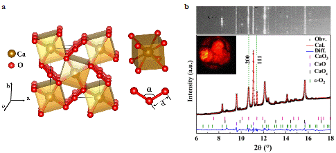 图1 CaO3晶体结构和高压下Ca-O化合物粉末X射线衍射图谱