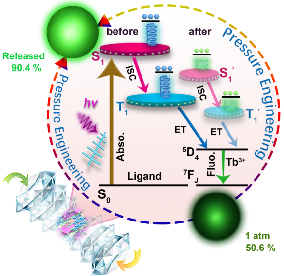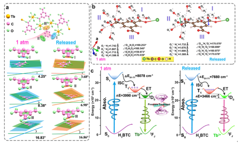 在本工作中,邹勃团队杨新一课题组以典型的荧光MOFs材料Tb(BTC)(H2O)6为研究对象,有机配体为均苯三甲酸,首次提出了利用氢键协同效应,提高相变势垒,截获高压相的新策略。通过压力处理策略增强氢键作用,锁住有机配体中由羧酸基团和苯环形成的共轭构型,优化系间窜越过程,有效地驱动有机配体到金属的能量转移(LMET)。压力下Tb(BTC)(H2O)6表现出独特的光学特性。在2.5 GPa以内,压力诱导三重态能级降低,有效地促进LMET过程,荧光逐渐增强。压力完全释放后,Tb(BTC)(H2O)6的荧光量子产率从初始50.6%提高到90.4%。原位高压同步辐射X射线衍射和红外光谱研究表明,压力处理后氢键作用增强,使有机配体中羧酸基团和苯环的扭曲构型得以保留至常压。通过GSAS软件分析在加压前和卸压后Tb(BTC)(H2O)6结构中原子间键长和键角的变化,发现压力处理后氢键作用增强,提高了有机配体中羧酸基团和苯环间的共轭程度,从而有效地促进系间窜越过程。此外,利用有机配体的紫外-可见吸收光谱及Gd-BTC MOFs的最短磷光发射光谱分别计算有机配体的单重态和三重能级。结果表明,压力处理后有机配体三重态和单重态的能级差为7880 cm-1,小于初始条件下的能级差(8078 cm-1)。探究了配体三重态与金属离子的能量转移过程,发现压力处理后,有机配体三重态与金属离子间的能级差(3466 cm-1)比初始状态下的能级差(3990 cm-1)小524 cm-1,表明压力降低了单重态和三重态能级,使其更接近金属离子能级。这有利于提高LMET过程,从而实现常压下Tb(BTC)(H2O)6绿色荧光增强。