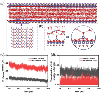 图:(a)超大MXenes-水体系结构示意图。(b)水中氧化物的局域构型。(c)V2CO2中不同类型V原子和水中O原子之间的平均距离。(d)水分子的物理吸附概率。