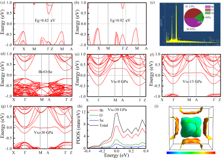 图2. (a,b)分别为完美Bi2O2Se在0和30 GPa下的能带结构。(c) Bi2O2Se的EDX分析。(d) 4×4×2 Bi2O2Se超晶胞在0 GPa下的能带结构。(e-g)分别为含有Se空位的Bi2O2Se在0、15和30 GPa下的能带结构。(h) 30 GPa下含有Se空位的Bi2O2Se的PDOS。(i) Se原子在30 GPa下对费米表面的贡献。