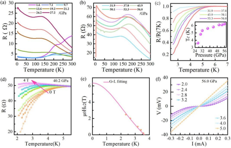 图1. (a,b) Bi2O2Se在1.6至56 GPa不同压力下的电阻与压力关系。(c)压力高于31.9 GPa时在低温区归一化电阻(R/R(7K))与温度关系。插图描述了超导电性起始温度与压力之间的关系。(d)在40.2 GPa下Bi2O2Se电阻-温度曲线随磁场的变化。(e)使用Ginzburg−Landau (GL)公式对Tc - H曲线的最佳拟合。(f) Tc附近不同温度下的V−I曲线。