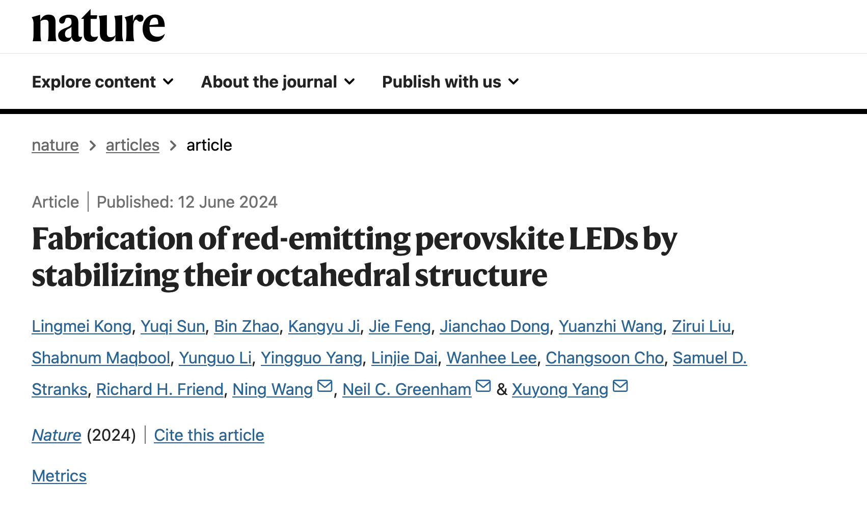 凝聚态物理系王宁教授团队与剑桥大学卡文迪许实验室Neil C. Greenham教授团队、上海大学新型显示技术及应用集成教育部重点实验室杨绪勇教授团队等人的合作研究成果:“Fabrication of red-emitting perovskite LEDs by stabilizing their octahedral structure” (Nature, 2024,DOI: //doi.org/10.1038/s41586-024-07531-9)。