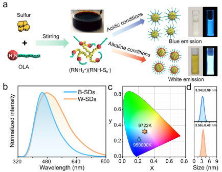 硫点具有优异的生物相容性和丰富的电子特性,被广泛应用于医药、离子电池和聚合物工业。探索硫点的光响应性不仅为硫基电子器件和光电子学领域带来新的机遇,还为传统半导体量子点提供了一种廉价、环保的替代方案。近年来,硫点的发光特性引起了人们广泛关注,然而基于量子限域效应调控硫点发光受到了体硫固有带隙(2.79 eV)的限制。因此,科学家们致力于探索新的策略,以实现硫点的可调谐宽带发射。