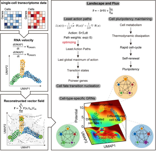 这项研究从单细胞高通量组学实验数据出发量化细胞分化和重编程等细胞命运抉择过程的驱动力并验证了非平衡景观和流理论。该工作还为结合“景观-流”理论和单细胞高通量测序实验提供了一个独特的框架,以了解细胞分化重编程的生理机制,以及更广泛的非平衡生物过程,如器官发育和疾病发病机制等。