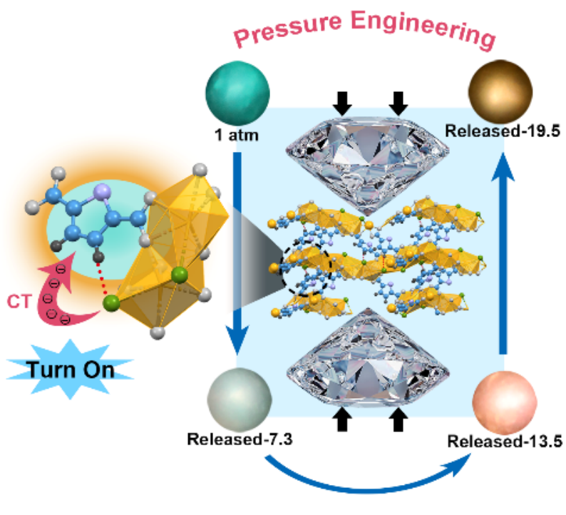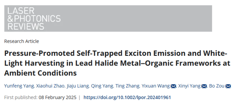 高压与超硬材料全国重点实验室/综合极端条件高压科学中心邹勃教授团队杨新一课题组通过压强处理工程调控卤化铅金属-有机框架(MOFs)材料的结构畸变程度,首次在MOFs材料中实现了压强诱导的自陷态激子(STE)发射增强,并在压强处理后获得了可控多色发光和高质量的白光发射。相关成果以“Pressure-Promoted Self-Trapped Exciton Emission and White-Light Harvesting in Lead Halide Metal–Organic Frameworks at Ambient Conditions”为题发表在国际学术期刊《Laser & Photonics Review》上。