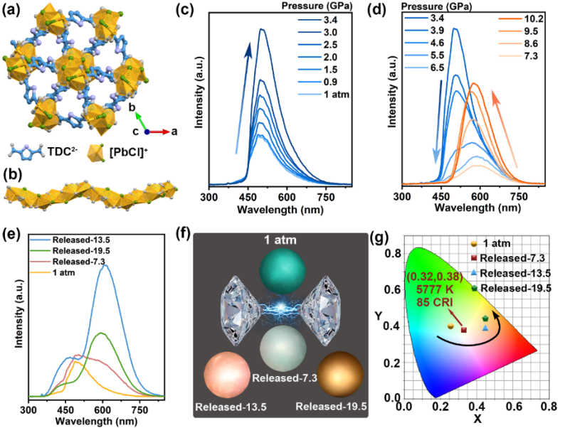 在这项工作中,杨新一课题组选择卤化铅MOFs-([Pb₂Cl₂]⁺[TDC]²⁻[(CH₃)₂NH₂]⁺, TMOF-8(Cl))作为研究对象,通过压强处理工程调整其晶体结构的畸变程度,实现了高质量的白光发射,其CIE坐标为(0.32,0.38),CCT为5777 K,显色指数(CRI)为85。此外,TMOF-8(Cl)在不同压强处理后,表现出从绿光到黄光的可调发射。从13.5 GPa释放压强后,可以获得4倍增强的橙红光发射。实验和第一性原理计算表明,压强处理后结构无法恢复到初始状态,保留了高压下Pb-s轨道与TDC²⁻配体能级之间增强的电子耦合,并增强了无机[PbCl]⁺单元和有机配体之间的氢键相互作用。在这两种因素的协同效应下,开启了从无机[PbCl]⁺单元向有机配体的电荷转移(CT)通道。通过调节STE和CT发射的相对强度,实现了可控多色发光和白光发射。本研究为MOFs材料中宽带STE发射的调制提供了新的视角,为开发高质量的单相白光发射材料提供了新思路。