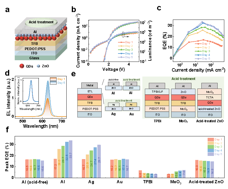 Fig. 1 | Positive-ageing effect of QLEDs. a, Device structure of the red QLED. b, J-V-L and c, EQE-J characteristics of the aged device stored for 1–5 days. d, EL spectra of the device before and after aging, driven at 3 V. The insert depicts the normalized EL spectra. e, Schematic diagram of ZnO-based QLEDs with different metal cathodes (Al, Ag, and Au), labeled as devices Al (acid-free), Al, Ag, and Au, respectively; TPBi-based QLEDs, labeled as device TPBi; MoO3-based QLEDs, labeled as device MoO3; and inverted QLEDs with acid-treated ZnO, labeled as device acid-treated ZnO. f, EQE variation of these devices during storage ageing.