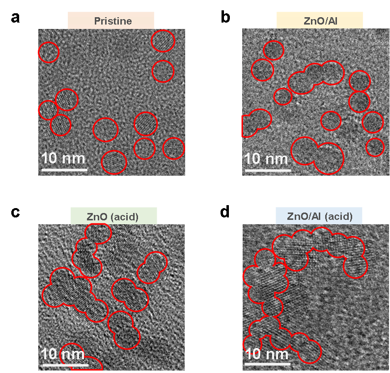 Fig. 4 | Morphology of the ZnO NPs. a-d, TEM images of (a) pristine ZnO, (b) Al-deposited ZnO, (c) ZnO with acid treatment, and (d) Al-deposited ZnO with acid treatment.