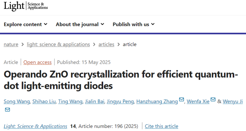 纪文宇、张汉壮教授联合电子学院谢文法教授和刘士浩副教授等人,系统研究了老化过程中酸及金属对ZnO NPs薄膜形貌及光电特性的影响,通过系列原位表征,揭示了基于ZnO纳米粒子薄膜的杂化QLED器件正老化效应的机制。研究发现,酸的作用是诱导了ZnO NP的原位重结晶过程。具体来说,在酸的作用下,ZnO NP发生原位融合(再结晶),此种融合是沿着氧化锌晶体c轴方向,最终形成长程的ZnO晶体,并且粒子的缺陷得到一定程度的钝化。活性金属离子(如Al和Ag离子)从阴极到ZnO中的扩散对ZnO的再结晶起到促进作用,同时进一步钝化了ZnO粒子中的缺陷。最终,重结晶后的ZnO NP薄膜的载流子浓度得到了降低,而电子迁移率得到了极大提高。高的电子迁移率保证了高效的电子注入,而低的载流子浓度抑制了载流子对量子点中激子的猝灭作用。此外,ZnO的陷阱态被钝化,也显著抑制了其对激子的猝灭作用。最终,基于ZnO NP的红色QLED的外量子效率(EQE)从17.2%提升至33.7%。这一结果为QLED电子传输层的优化设计提供了指导。相关结果发表在Light: Science & Applications 期刊上。