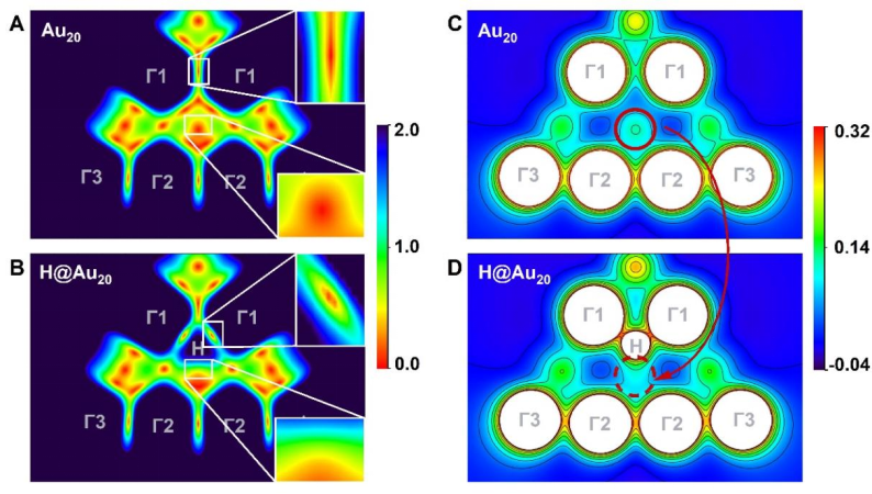 2. 键合变化与机理阐释。(A) Au20和(B) H@Au20的相互作用区域指示函数图。(C) Au20和(D) H@Au20的总静电势图。色标数值单位为原子单位。