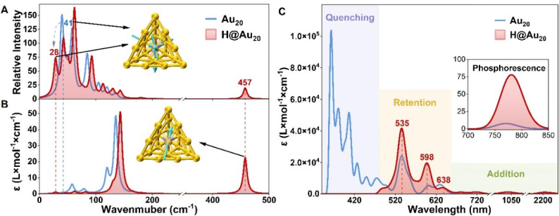 3. 振动光谱、紫外-可见吸收光谱与磷光发射光谱。(A) Au20和H@Au20的拉曼光谱及(B) 红外光谱。图中标注了两个特征峰对应的振动模式。(C) 经自旋轨道耦合校正的Au20和H@Au20紫外-可见吸收光谱与磷光发射光谱。"ε"表示摩尔吸光系数。