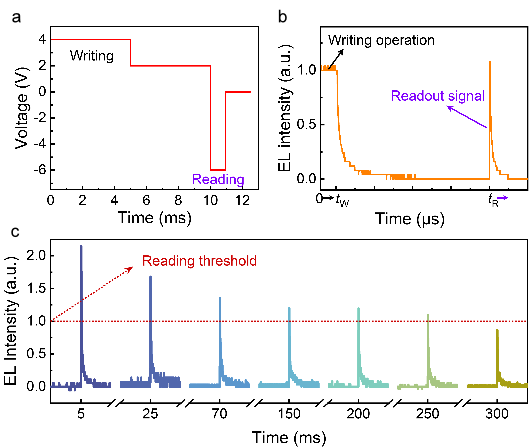 Figure 5. Modelling of the write-read process. (a) Drive voltage waveform. (b) Single write-read cycle. (c) Read operations at varying time delays under identical write conditions.