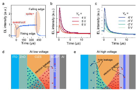 Figure 3. (a) Whole TrEL response of QLED with PPT, driven under a voltage pulse with frequency of 1000 Hz, Vw = 4.0 V, tw = 400 µs, VR = 0 V. Falling edges of TrEL response of PPT-containing QLED with (b) various Vw and (c) VR. The EL intensity is normalized according to the steady-state intensity during the on-period. The ts = 0 for the above measurements. Illustration of the charge distribution within the device under (d) low and (e) high driving voltage.