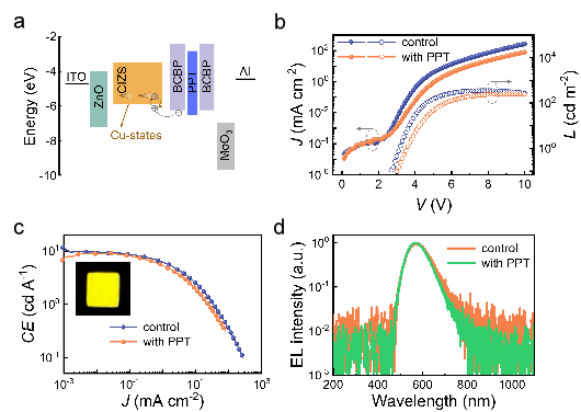 Figure 2. (a) Flat energy levels of materials used in this work. (b) J–V–L, (c) EQE–J, and (d) EL spectra of QLEDs with and without PPT electron-capturing unit.