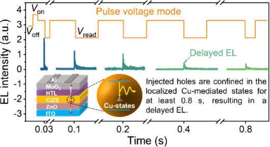 纪文宇教授和张汉壮教授等人制备了基于Cu-In-Zn-S(CIZS)量子点的电子发光器件,并系统地探究了影响其空穴储存的关键因素,通过瞬态电致发光(TrEL)和瞬态光致发光(TrPL)等表征,揭示了基于CIZS量子点器件中的电荷分布及工作机理。研究表明,在脉冲电压的激励下,该器件的TrEL响应在上升沿与下降沿分别表现出显著的电致发光过冲和尖峰现象,这一独特特征源于器件内部的电荷存储效应。该性能的获得主要归因于两方面:其一,CIZS量子点中Cu相关缺陷态能级形成局域态,有效延长了空穴驻留的时间;其二,合理的器件结构设计进一步强化了空穴限制效应,即选用更深HOMO能级的BCBP作为空穴传输层(HTL)抑制空穴回迁,同时在HTL中插入约为3 nm厚的PPT薄层,利用其较低的LUMO能级和自发取向极化特性,能够有效俘获泄漏的电子,从而进一步提升器件的空穴存储。此外,该文章还系统探讨了器件中电荷存储效应对脉冲驱动参数的依赖关系及其影响机制。研究发现,适当延长脉冲驱动时间(tw)及提高反向驱动电压(VR)有助于增强量子点中空穴的存储效应与剩余载流子的提取效率,从而显著提升器件的“读取”能力。基于该独特特性,本文构建了一种基于常规QLED的写入–读取工作模式。器件实现了长达0.8秒的空穴存储时间,为QLED开辟新的工作模式和应用前景,特别是在防伪识别等对高密度存储与响应延迟具有特殊需求的场景中展现出潜力。相关成果以“Second-Scale Hole Storage in Electrically Driven Multinary Quantum Dots”为题目,发表在Nano letters期刊上。