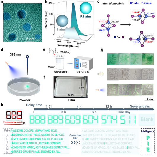 针对上述问题,肖冠军教授等人基于低维铜基卤化物多发光中心相互作用的刺激响应动态调控特性,引入具有大空间位阻的四丙铵阳离子(TPA+),首次在(TPA)CuI2纳米晶体系中,实现了低压强阈值触发、且具有显著光学对比度的压致不可逆荧光转变。在施加低至0.6 GPa的压强处理下,(TPA)CuI2纳米晶即可从原始的暗白光转变为明亮的蓝绿光。结构分析表明:0.6 GPa时发生了单斜相到三斜相的结构相变,导致[Cu2I4]2-二聚体对称性破缺,有效抑制了由簇中心电荷转移与偶极相互作用所引发的低能级自陷态形成,阻断了低能量的辐射复合通道。此外,相变后显著增强的氢键相互作用与TPA+的大空间位阻效应有效促进了高压亚稳相的保留。鉴于本研究中截获高压亚稳相的触发压强较低,可在日常生活中即可实现,团队进一步以聚乙烯醇为基底制备了基于 (TPA)CuI2纳米晶的荧光压强成像薄膜。该薄膜可直接应用于书写或盖印等静态行为的荧光信息显示,例如使用带有“字母圈