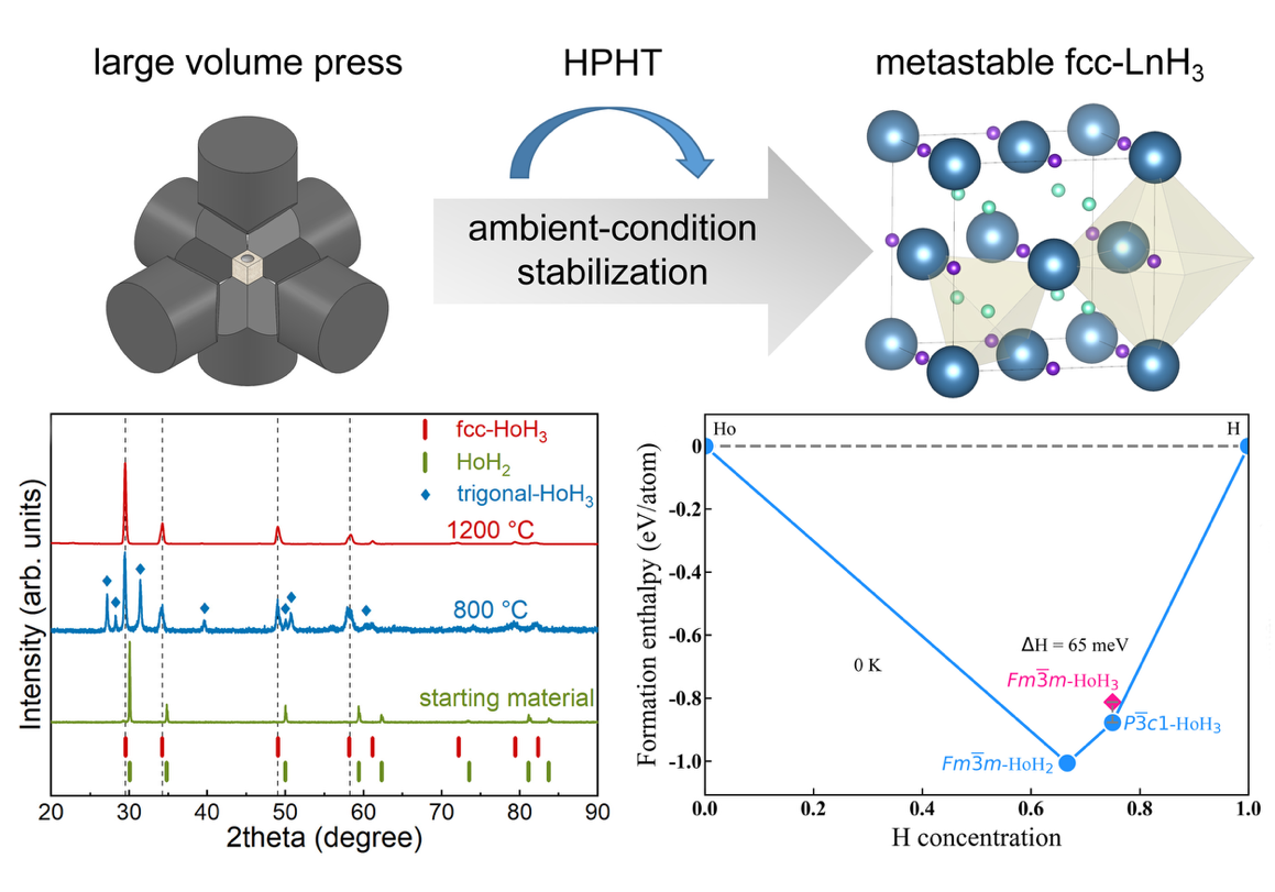 氢化物在高压条件下往往会出现新的结构相与物性,但不少高压相在卸压过程中会回变为常压稳定相,甚至发生分解,从而限制了其在常压环境下的系统表征与进一步研究。针对这一难点,研究团队以稀土二氢化物(LnH2)为前驱体,采用氨硼烷作为可控固体氢源,在大腔体压机(LVP)高温高压条件下实现受控氢化,并通过优化压力-温度-时间(P-T-t)路径,将原本仅在高压下出现的亚稳面心立方(fcc)LnH3 相截获并保留至室温常压。