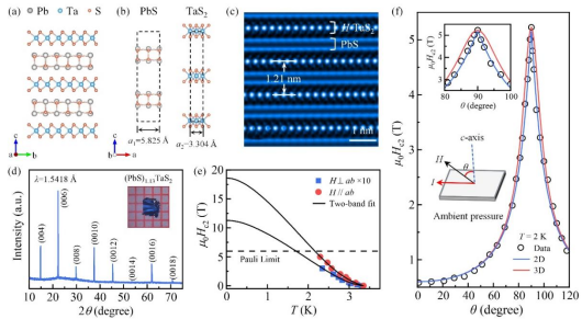 图1. 常压下(PbS)1.13TaS2呈现典型的失配层状结构,其超导各向异性比γ = μ0H//ab c2(0)/μ0H⊥ab c2(0) = 16.9,且角分辨的上临界场μ0Hc2符合2D Tinkham模型,表明超导转变具有显著的2D特征。