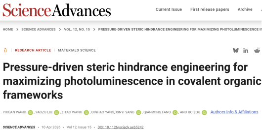 无机合成与制备化学全国重点实验室方千荣教授合作,利用压强处理工程和空间位阻效应实现芘基亚胺共价有机框架(COFs)材料Py-Da-4CH3-COF黄色荧光增强与截获,荧光量子产率从14.7%显著提高到91.5%。相关研究成果以“Pressure-driven steric hindrance engineering for maximizing photoluminescence in covalent organic frameworks”为题发表在《Science Advances》上。