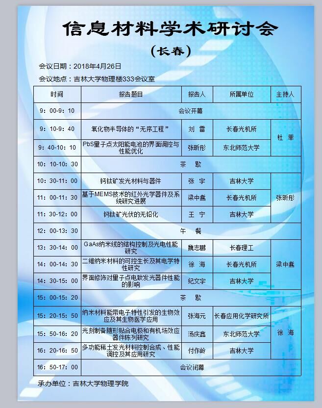 由字母圈 主办的“信息材料学术研讨会”将于2018年4月26日在字母圈 物理楼333会议室举行。本次会议旨在促进学院广大师生在物理相关领域的研究及交流,提高我院教师科研水平、科研能力。会议邀请中国科学院长春光学精密机械与物理研究所、中国科学院长春应用化学研究所、东北师范大学、长春理工大学等高校及科研机构的多位知名专家学者参加。欢迎广大师生积极参与!