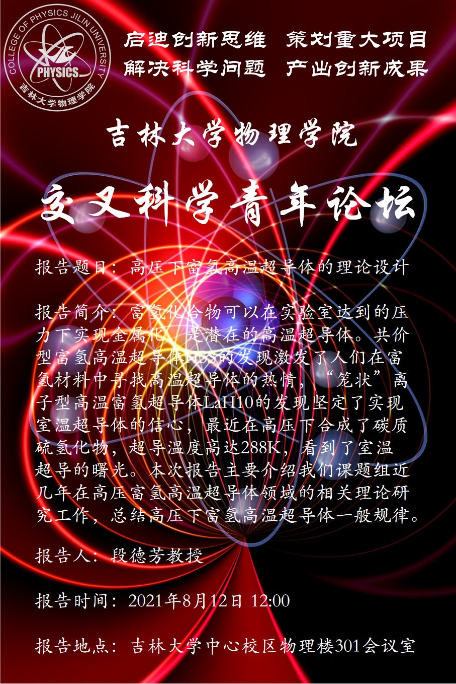 由于非氢元素的化学预压缩,富氢化合物可以在实验室达到的压力下实现金属化,是潜在的高温超导体,是高压领域的热点材料之一。共价型富氢高温超导体H3S(Tc=200 K)的发现激发了人们在富氢材料中寻找高温超导体的热情,“笼状”离子型高温富氢超导体LaH10(Tc= 250 K)的发现坚定了实现室温超导体的信心,最近实验上在高压下合成了碳质硫氢化物,超导温度高达288K,看到了室温超导的曙光。本次报告主要介绍我们课题组近几年在高压富氢高温超导体领域的相关理论研究工作,总结高压下富氢高温超导体一般规律。