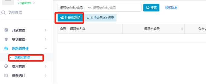 2. 点击课题组管理,搜索课题组名称,如果未找到课题组,则需注册课题组。
