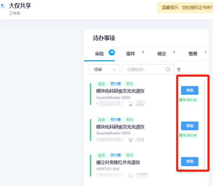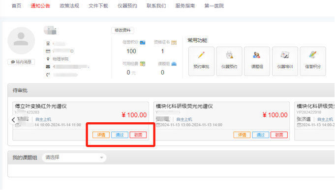 7. 仪器管理员登陆系统,在系统字母圈可看到相应的预约情况,经过管理员审批同意后,则顺利完成仪器预约。