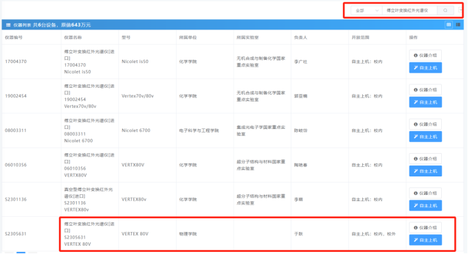 3. 在搜索框中搜索需要用到的设备,这里以傅立叶变换红外光谱仪第一项压片红外测试为例,选择自主上机。