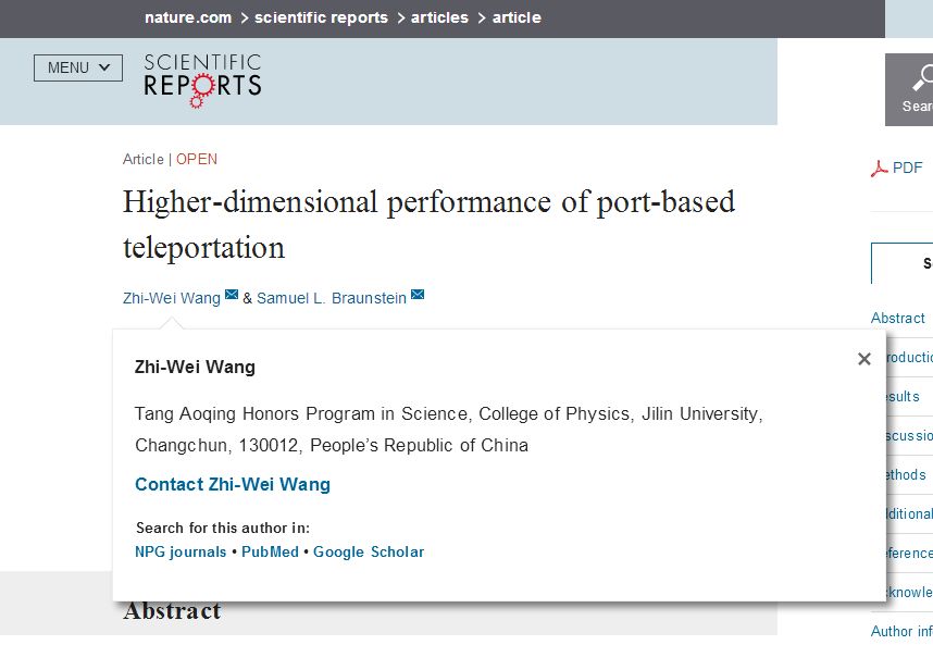 9月8日,我院2016届唐敖庆班学生--王志伟同学在Nature 旗下的“Scientific Reports”杂志上以第一作者兼通讯作者身份发表了题为《基于端口的量子隐形传态的高维表现》(Higher-dimensional Performance of Port-based Teleportation)的研究论文。论文由王志伟同学在本科毕业前夕完成并投稿,历经3个多月的等待,论文于昨日正式发表。