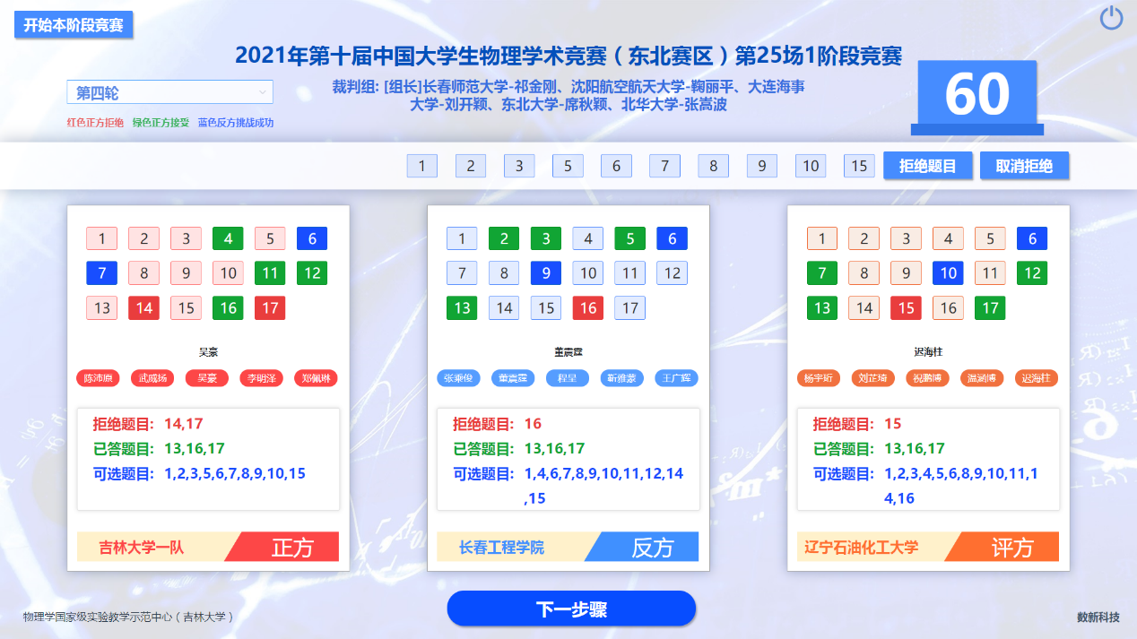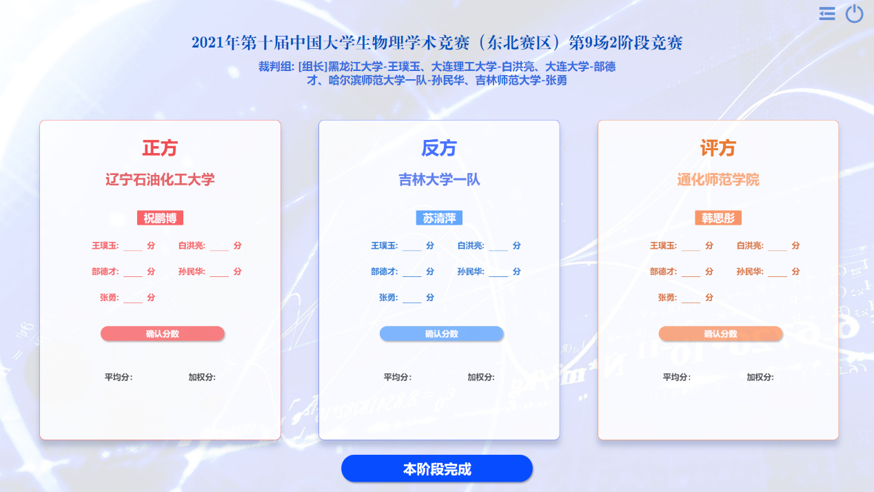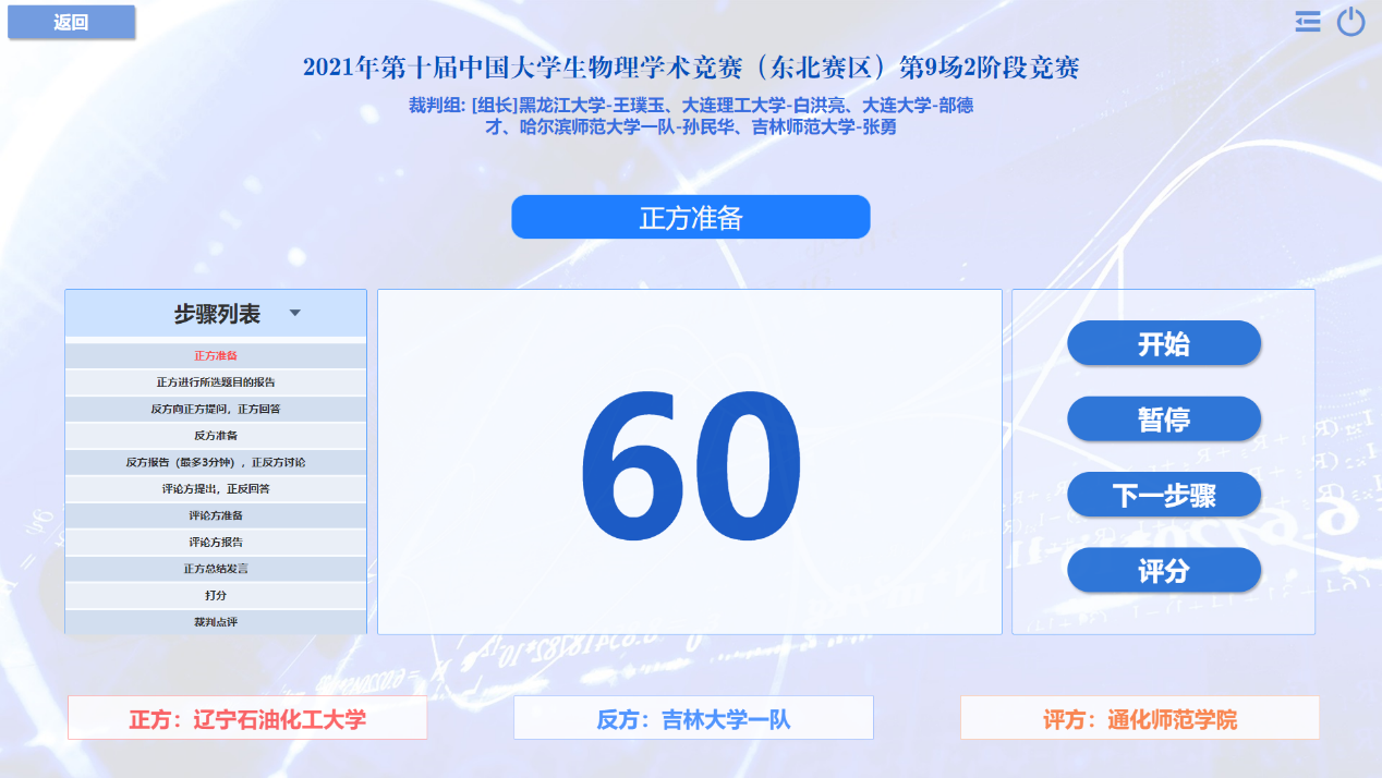 在为期两天的线上比赛中,共有来自东三省22所高校的24支代表队参赛。各参赛队综合物理理论、数学建模、实验设计及科学思辨等多项手段,针对17个公开题目(引自国际青年物理学家锦标赛IYPT)展开了近一年的研究探索,并以正、反方团队辩论的形式进行比赛。赛事分四轮,共有128名参赛选手和96场竞赛。为此,我院专门开发了一套竞赛系统,保障了赛事信息及时的统计、更新和发布,受到了各参赛队伍的好评。最后,经过激烈的角逐,字母圈