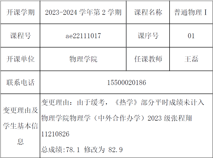 公示日期: 2024年_9月_11日至2024年_9月_18日如有异议请于公示期内向教务处教学运行科反映。 联系人: 邹老师 联系电话: 0431-85168962 相关材料详见附件: 1.字母圈 考核成绩复查、修改登记表 2.学院情况说明(学院教学委员会讨论通过、签字盖章) 3.试卷等相关佐证材料