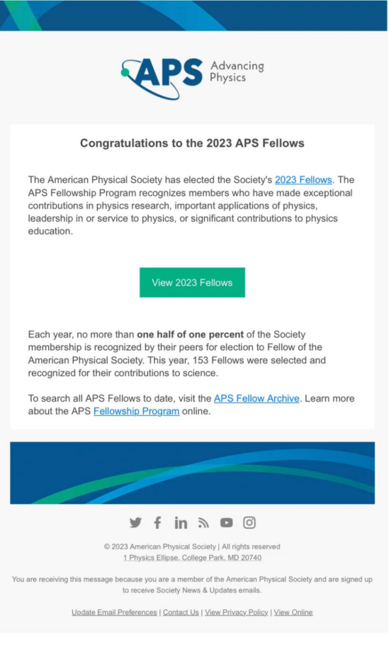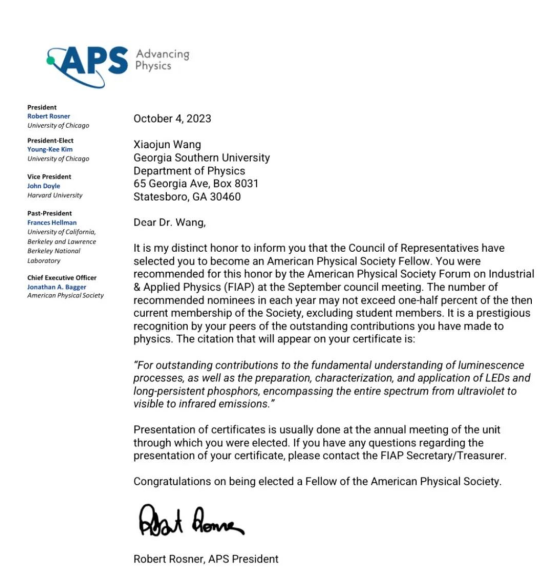 APS是国际物理学领域的权威组织,每年推荐的全球APS Fellow候选人数不超过会员总数的千分之五。本次入选是物理学领域同行们对王笑军教授贡献所给予的高度认可。