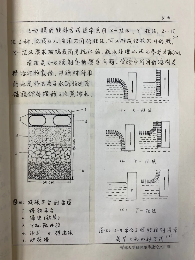 导师给我论文的题目是关于“功能单分子薄膜(Langmuir-Blodgett膜,简称LB薄膜)”中的能量转移研究。LB薄膜在八十年代初是国际上的热点研究方向之一,在国内相当超前。我是国内第二个攻读此方向的硕士研究生。第一个是我的同门师兄滕秋克。导师对前沿科研方向的把握是敏锐和准确的,但这一选题也使我们面临巨大的挑战。当时组里的实验条件非常简陋,拉膜机是师兄自己搭建的,纯净水是同学们自己蒸馏的。实验需要防震,但没有经费买减震台。我要做的第一件事就是搭建减震台。从文献中查到一种方案,需要把炉灰、沙子筛好,加上碎塑料泡沫,一层层放在四个圆柱形的容器中,再放入四个汽车内胎,上边加上隔板,便是简易减震台了。文献中提到,飞机轮的内胎是最合适的,大小适中,弹性也更好。于是,我们绞尽脑汁想尽办法去找飞机轮内胎。最后跑到上海飞机场,几番软磨硬泡,竟然真的要到了四个内胎,完成了减震台搭建。