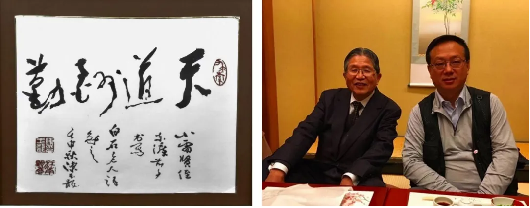 图4 左图:赴日前一天姑父陈玉龙教授书“天道酬勤”,并撰写题跋:“小雷贤侄,东渡前夕写白石老人语勉之”;右图:和藤岛先生2018年在东京的合影。