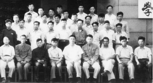 前排右起:温希凡(系秘书 党支部书记)孙家齐(处秘书)刘汉仁(教务处处长)朱光亚(教授)黄振邦(副教授)吴式枢(教授)高墀恩(教授)刘靖(副校长)王湘浩(教授)