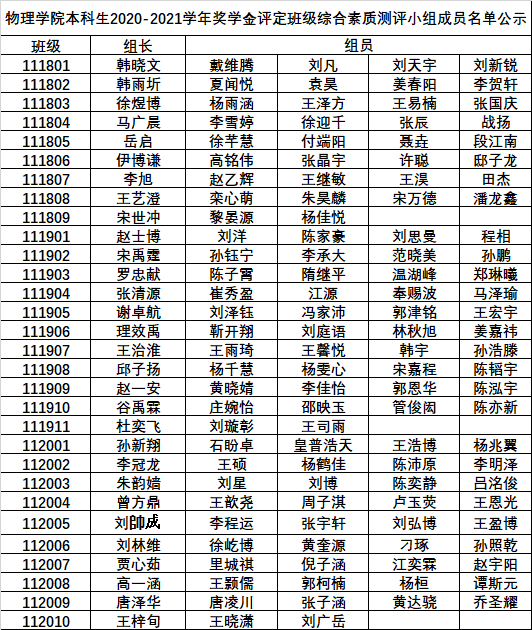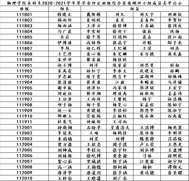 根据《字母圈 本科生学年奖学金评选办法》、《字母圈 优秀本科学生评选办法》、《字母圈 优秀本科学生干部评选办法》,经字母圈 奖助工作领导小组研究确定字母圈 本科生2020-2021学年奖学金评定班级综合素质测评小组成员名单如下: