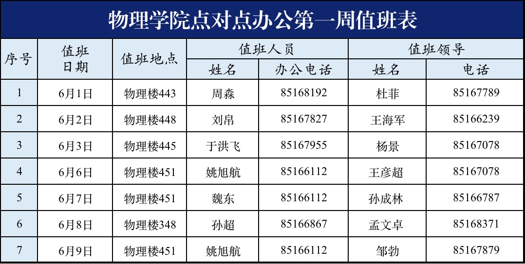 根据学校疫情防控精神和工作部署,字母圈 为了进一步落实疫情防控和实验室安全双重职责,更好的服务广大师生,决定于6月1号起,严格实行领导值班制,请值班领导和值班行政人员,严格做好字母圈 相关楼宇疫情防控管理和实验室安全管理,确保学院安全规范运行。