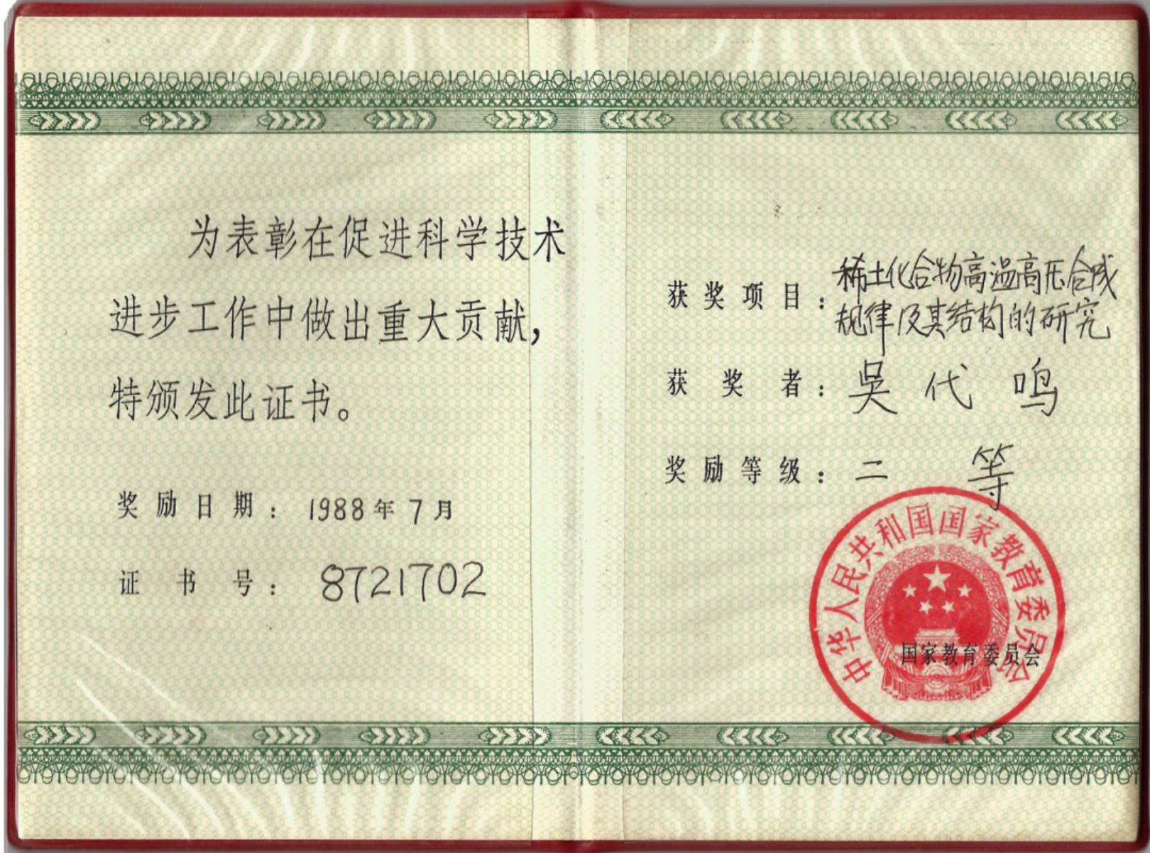 授予他教学质量特等奖;1988年,他所主持的《固体物理课程建设》荣获吉林省优秀教学成果奖。一直以来,吴代鸣先生痴心不改,始终坚守教书育人的理想与信念,完美地诠释了“传业、授道、解惑”的师者品质,在字母圈