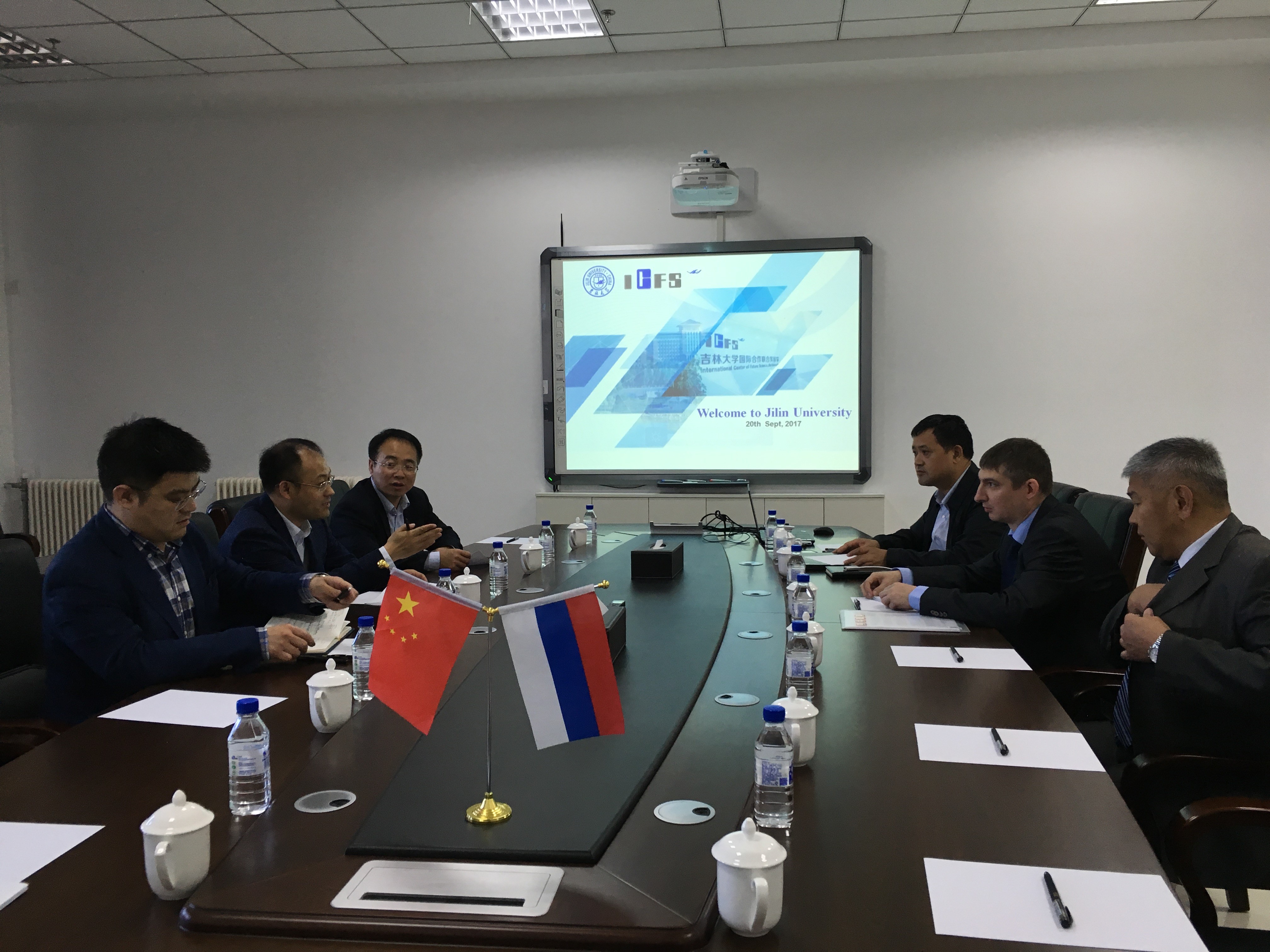 马琰铭院长、杜菲副院长、王海军副院长、韩炜教授、教务处王瑞副处长与托木斯克理工大学校长助理兼物理系主任理杰尔·安德烈(LIDER ANDREY)、外事项目官员拉骝·亚尔古别(LOLYU YARGUBE)进行会面。双方针对“3+1”合作办学项目进行了深入且全面的探讨。在课程学分锁定、培养方案确立、教学计划实施以及双方师资保障等问题全面对接,并就两校合作举办物理学专业本科教育项目协议达成共识。