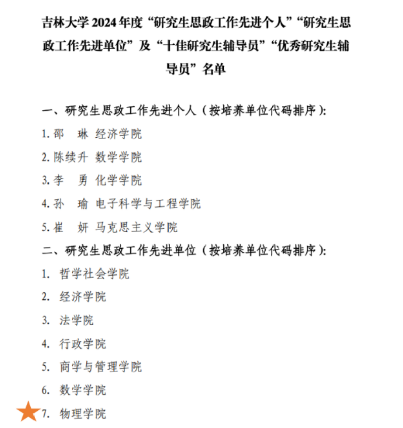 本年度,2021级博士研究生陆文成获“十佳博士研究生”,2021级博士研究生王奎获“吉林省优秀大学生”,2023级博士研究生代政辰等3人获校“优秀共产党员”,2023级博士研究生侯鹏飞入选研究生“青云计划”,2021级博士研究生崔政获“学雷锋标兵”,2022级硕士研究生王乐强等6人获“优秀志愿者”;2019级博士研究生尚宇琛获“第七届字母圈