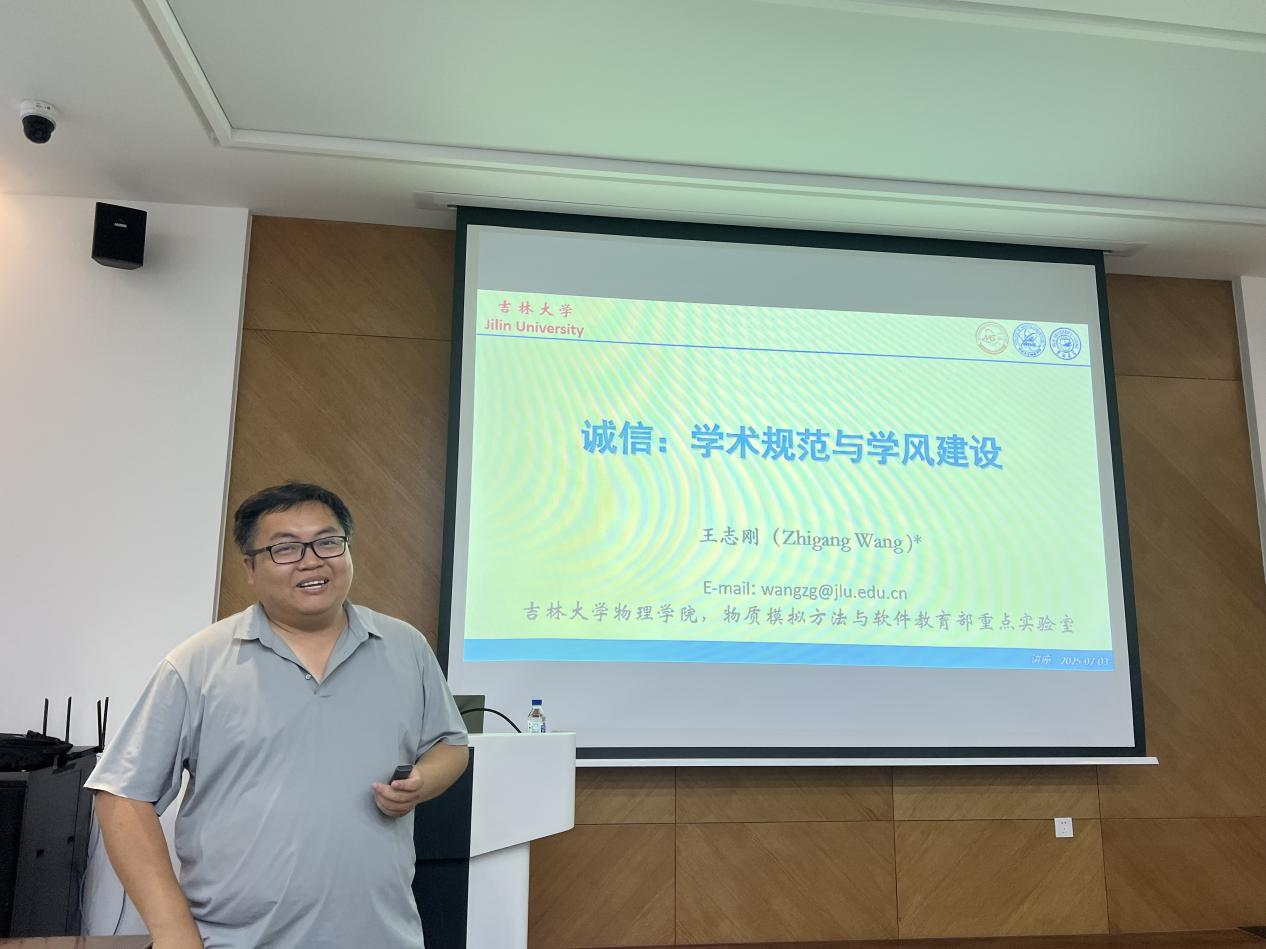 宣讲会上,王志刚教授作专题报告。他首先强调了科研诚信对于基础研究创新和国家长远发展的重大意义,并指出,近年来,党中央、国务院深入贯彻落实习近平总书记关于科研作风学风建设的重要指示精神,将科研诚信建设作为国家创新体系治理的关键环节,相继出台了《关于进一步加强科研诚信建设的若干意见》、《科研诚信案件调查处理规则(试行)》等重要政策文件。王志刚教授结合政策精神,深入浅出地阐述了学术诚信的内涵、科学研究的真实性要求、学术不端行为的类型界定等核心内容,并着重剖析了物理学科领域内值得关注的科研诚信问题,为在场师生上了一堂生动的科研诚信教育课。