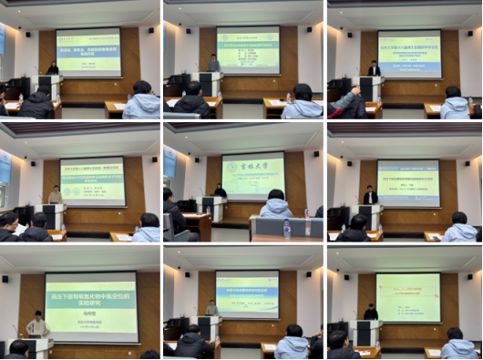 交流中,博士生们带来了多个领域的研究成果。极端条件物理与基础研究方面,涉及高压超导铌氢化物中氢空位探究、高压强下LaN的结构及物性演化行为、压力工程实现有机分子多色发光、高压下碱金属熔化机制等内容,展现了基础物理研究的多元探索。能源物理领域,邻基参与效应优化醚基电解液、欠电位沉积引发剂应用等研究,为锂/锌离子电池性能提升提供了思路;催化与材料领域,杂原子层间限域修饰对氮化碳光催化析氢性能的影响研究、组装双单元聚合物促进光催化全解水等,引发了现场关注。此外,集成镁电池生物电子贴片、无重金属量子点、机器学习驱动超导材料研究等跨学科内容,覆盖电化学、生物电子、光谱分析等领域,为与会者带来了多元的学术视角。