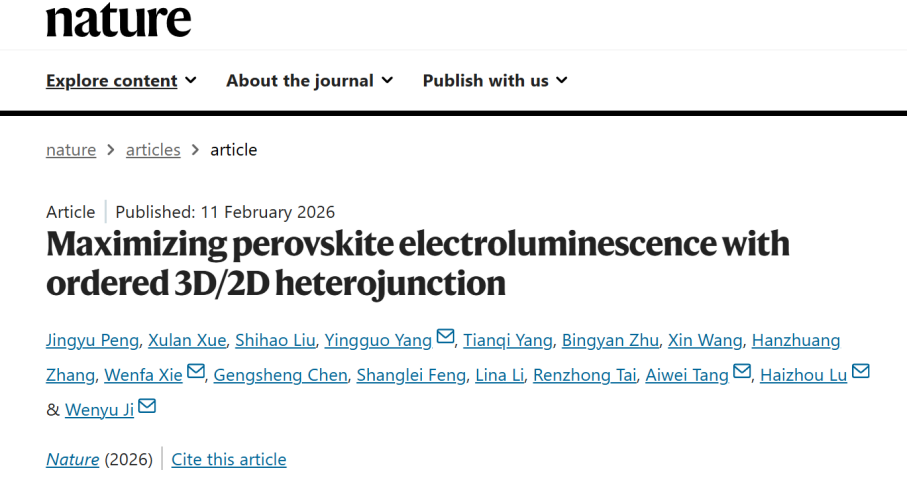 纪文宇、张汉壮教授团队联合电子学院谢文法教授、刘士浩副教授、复旦大学杨迎国教授、东南大学卢海洲教授及北京交通大学唐爱伟教授等研究团队,在钙钛矿电致发光器件(PeLED)发光界面调控及器件效率方面取得突破进展。研究团队通过“一步法”原位构建三维/二维(3D/2D)有序异质结钙钛矿薄膜的新策略,成功将绿光PeLED的外量子效率(EQE)提升至42.9%(经第三方认证为42.3%),刷新了该类器件的世界纪录。相关成果以《Maximizing perovskite electroluminescence with ordered 3D/2D heterojunction》为题发表于国际顶级期刊《Nature》。