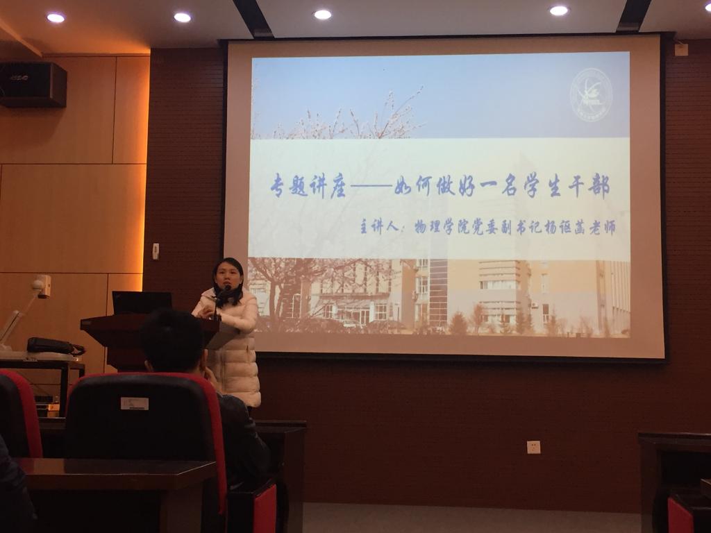 最后,学院党委副书记杨讴菡老师结合自身的经验以“如何做好一名学生干部”为主题为所有学生干部做了一场生动的讲座。杨讴菡老师从学生干部必须具备的“六大意识”即大局意识、责任意识、作为意识、学习意识、服务意识和反馈意识展开阐述和介绍。运用多个案例深入浅出的分析了在学生干部工作、学习、成长成才过程中的必要性和重要性。