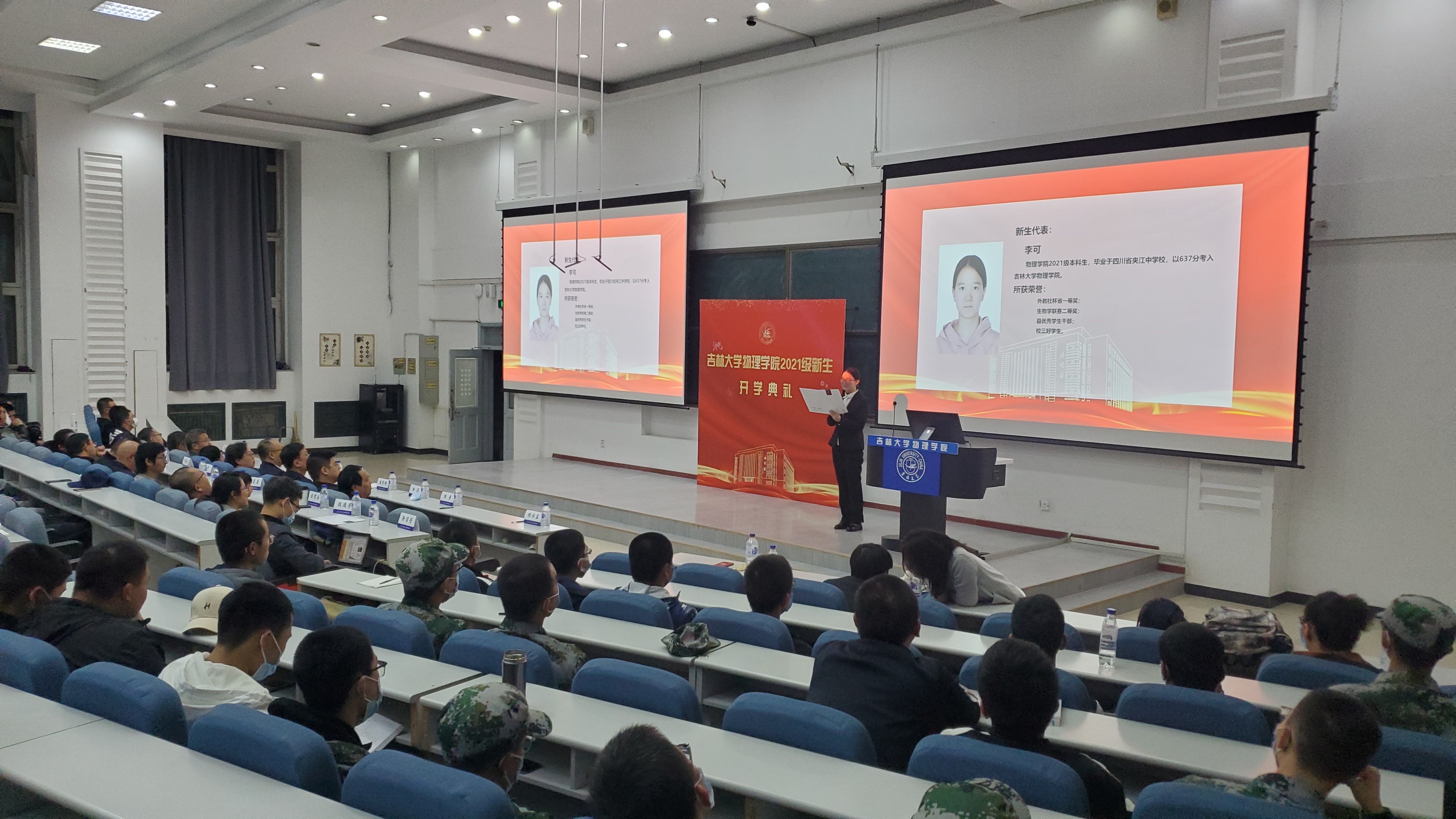 紧接着,学生代表发言。2021级李可同学作为新生代表,以昂扬的精神面貌,展现了 2021级新生不惧困难,怀着对物理的信仰,对未知的渴望,肩负着师长的嘱托,民族的希望,努力奋斗的精神品质。2020院长奖学金获得者之一的廖一朴同学作为老生代表向新同学们分享了自己在字母圈