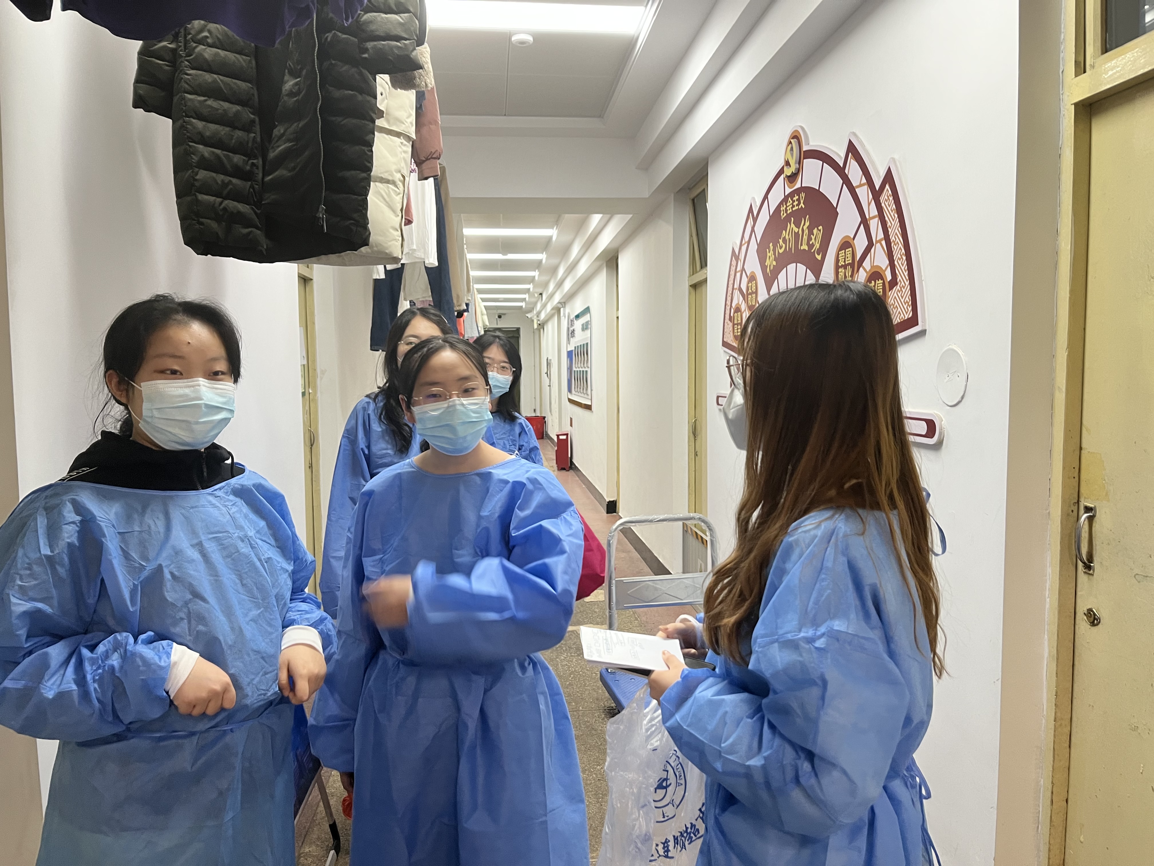 我主要是负责下达学校和楼内通知,统计数据,为大家解决生活上出现的问题和南二物院志愿者们的工作安排。我们的志愿者同学们每天为大家配送三餐和水,发放防疫物资、抗原自检卡、致远物资,还有帮楼内清洁阿姨回收餐盒。志愿者同学们的工作都很辛苦,经常需要六点多起床配送早餐,物资也很沉重女孩子们搬起来很困难,有时还需要帮忙把全楼的饭和水搬下车,但是,所有的志愿者们没有过一句抱怨,对所有的安排都积极配合,齐心协力,共同为保障同学们的封寝生活安心、舒心而努力。