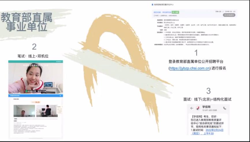 分享嘉宾李子越,声学专业,通过了吉林省定向选调生的选拔。李子越从报考条件、信息匹配、笔试准备、面试准备、面试经验等方面展开分享,他强调上岸的秘诀就是勤学多练、不走捷径、相信自己!