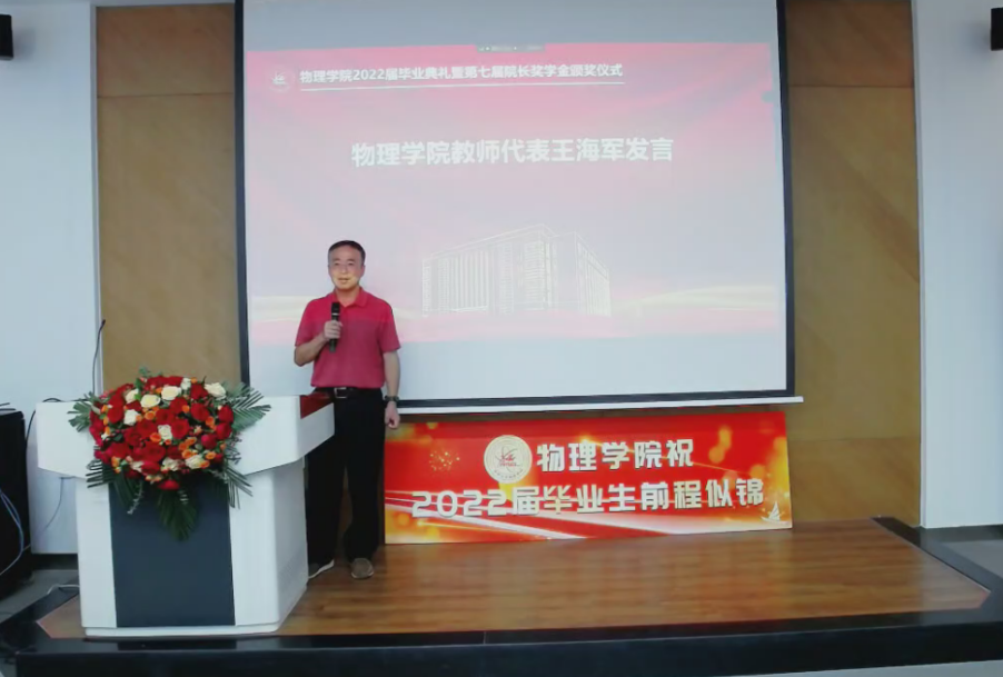教师代表王海军老师向全体毕业生送上了美好的祝贺与期望。在他看来,人不能离开集体,在学习生活中要明白“利他”的重要性。他用亲身经历教诲同学们,一个人或许很难,但在群体中很多问题都会迎刃而解,字母圈