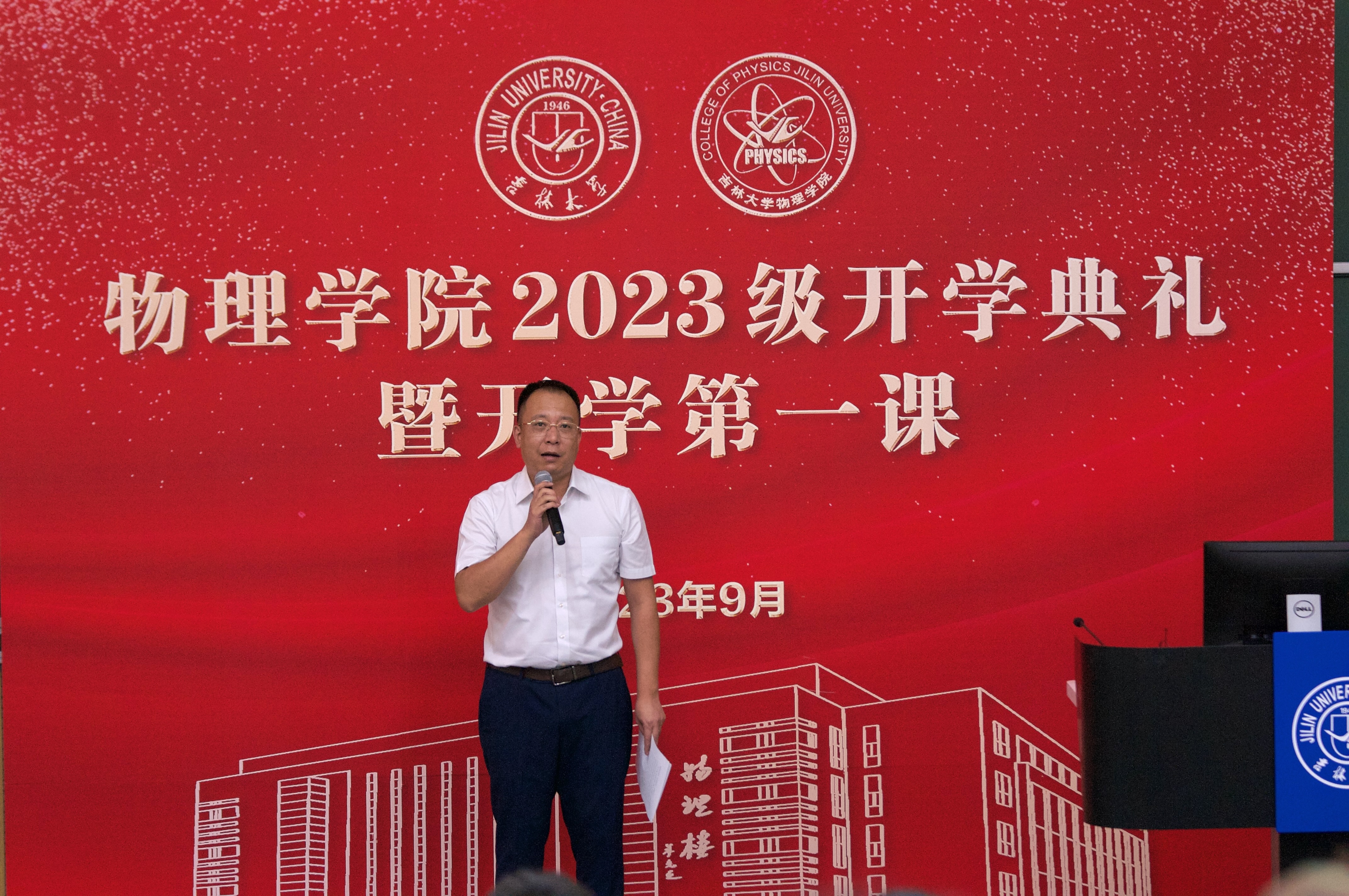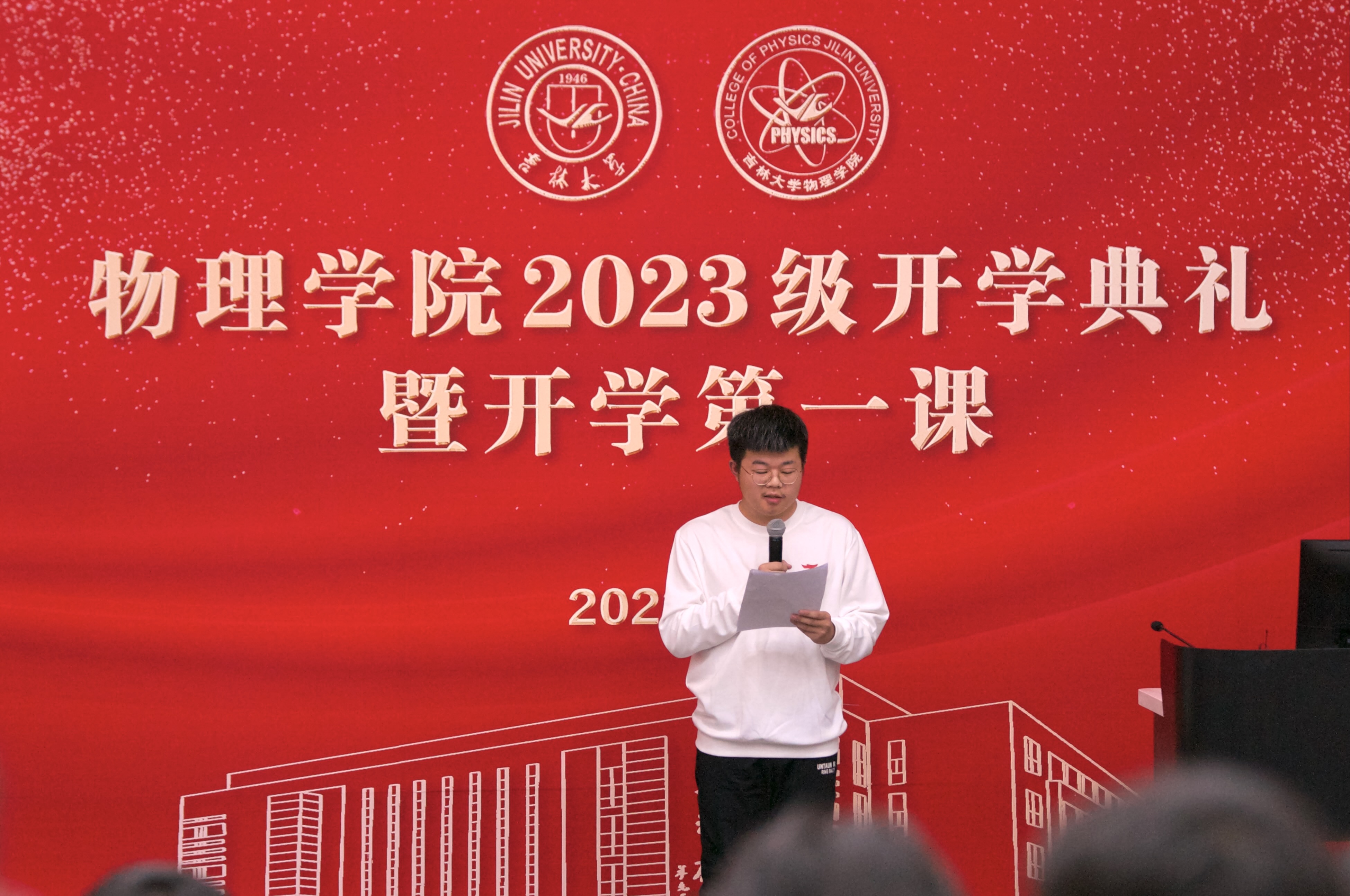 傅元浓同学作为新生代表进行了发言。他首先表达了入学之初在学院感受到的深情厚谊,代表新生对学院迎新工作表达感谢;之后从自身角度展望了对大学生活的憧憬,探讨物理学科在国家发展建设中的重要作用,并号召全体23级新同学珍惜大学时光,增长报效祖国的才干,争做一名合格的建设者。