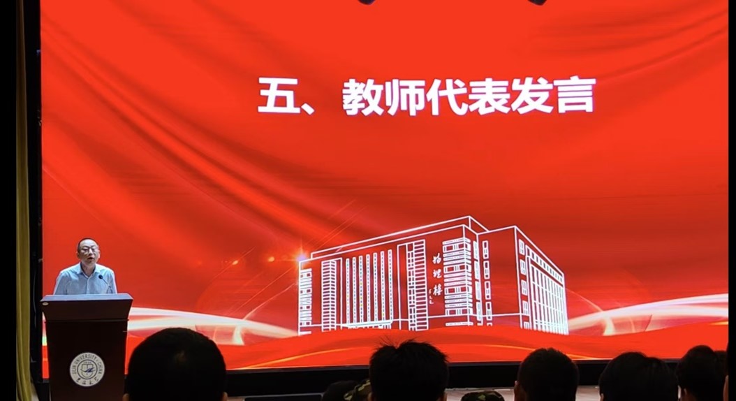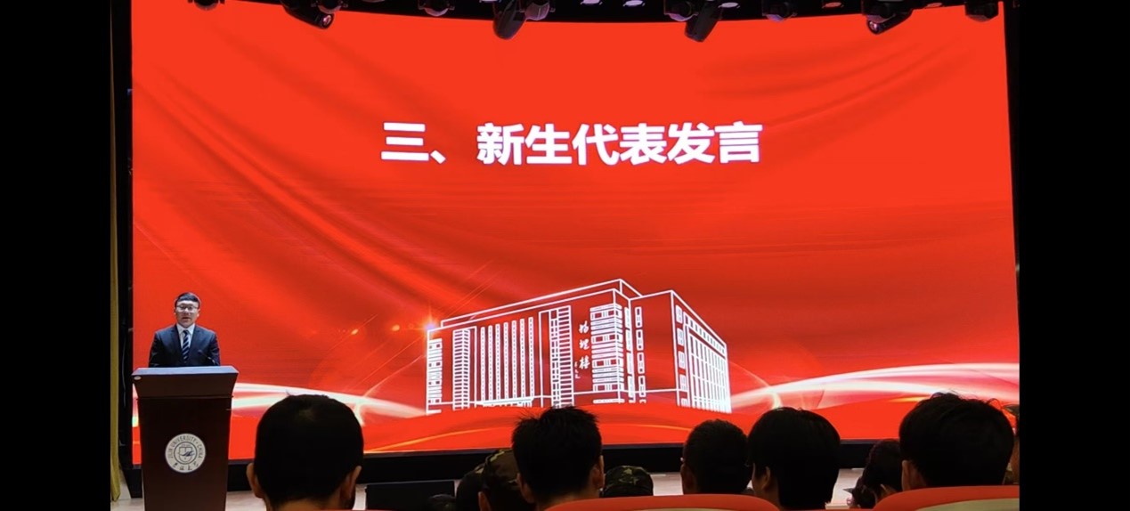 2021级本科生党伟作为在校生代表进行发言,分享了个人本科期间的成长经历,介绍了学院为本科生搭建的各类成长平台,最后党伟同学表达了过去几年成长过程中对物院每一位老师的感谢,希望学弟学妹们在度过一个开心、充实的大学生活的同时,也让自己走上“大学之道”。